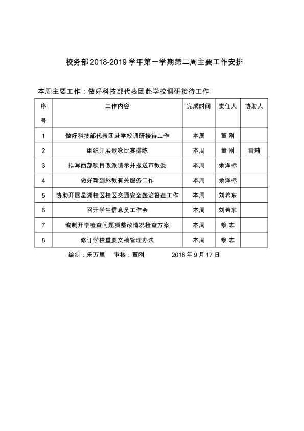 校务部2018-2019学年第一学期第二周主要工作安排