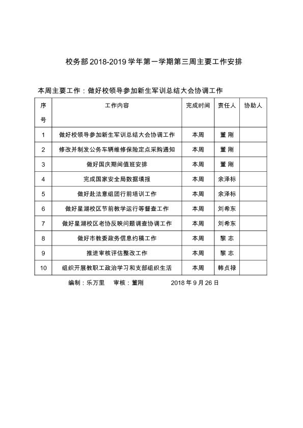 校务部2018-2019学年第一学期第三周主要工作安排